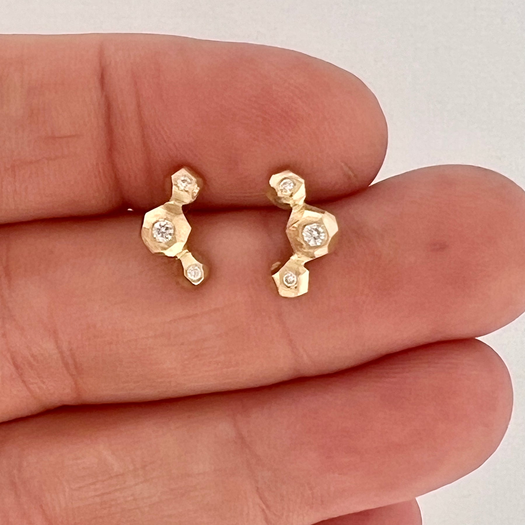 Sweet little 14k gold studs with diamond accents. Wear them in your main piercing, your second hole or in a cartilage piercing. The metal's faceted texture is one of Danielle's signature design elements that reflect the light, giving the surface a lovely, organic sparkle.