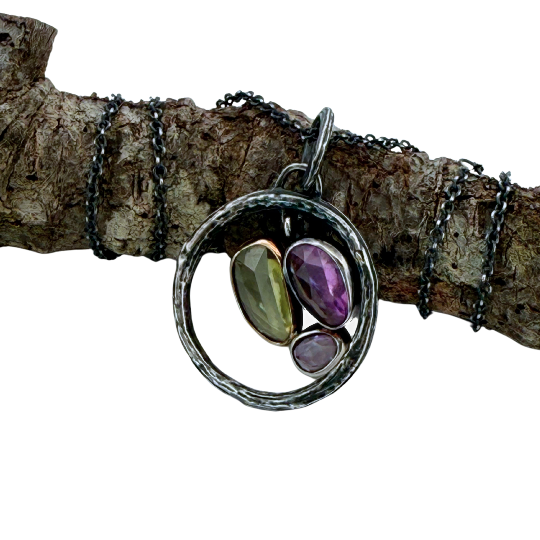 Sapphires sit at a 9 on the Mohs hardness scale. This shield of sapphires floats encircled by a silver peony stem.