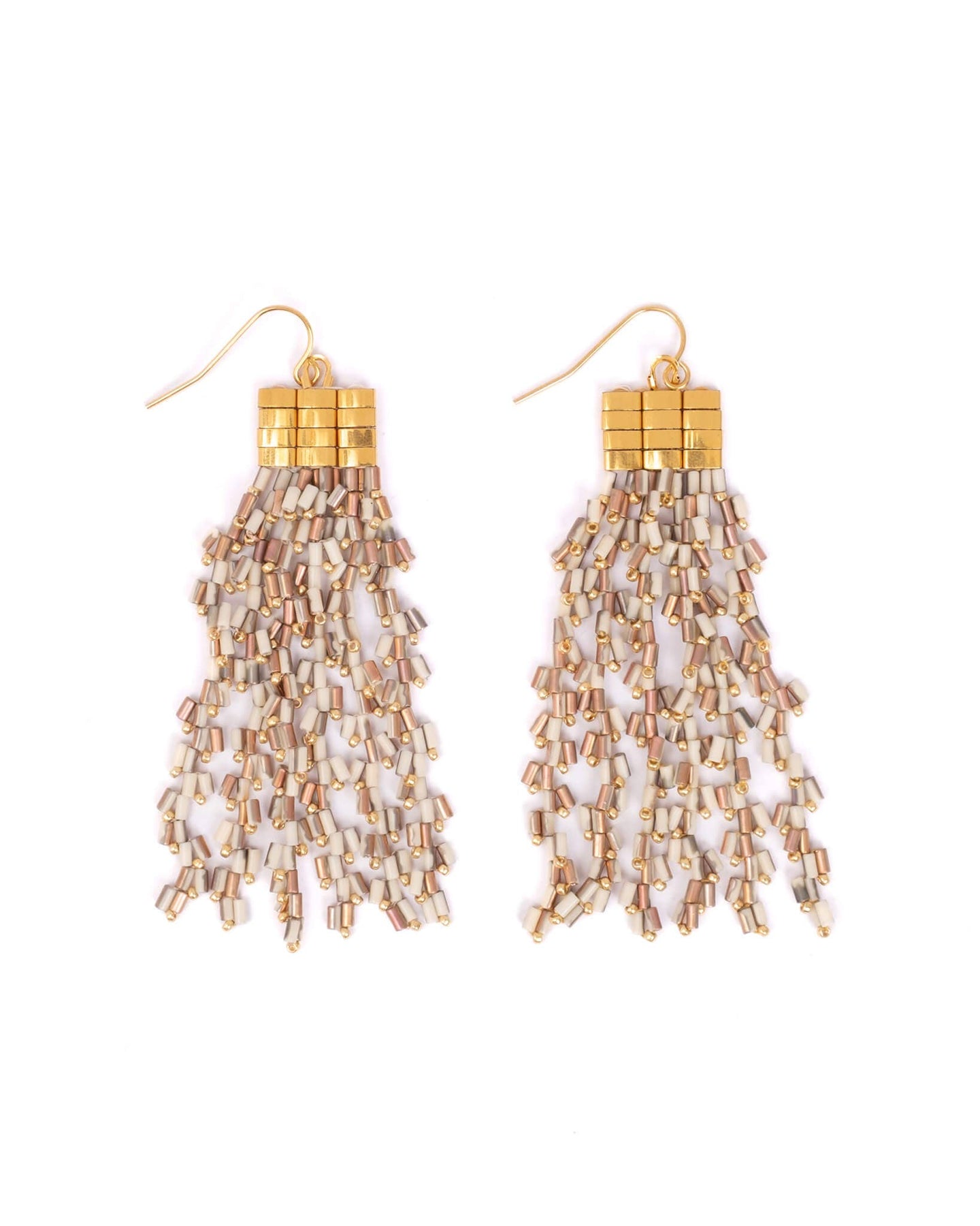 These luxurious beaded fringe earrings are perfect for making a bold yet elegant statement this holiday season. Combining artisanal craftsmanship with a modern edge, they are lightweight and eye catching. Made from premium Japanese glass beads, each earring is topped with woven 24K gold-plated Tila beads, from which hand-strung metallic specked tubular beads cascade. The movement is dramatic and fluid, creating a shimmering effect perfect to compliment festive holiday looks. These earrings are handwoven by women artisans in Medellin, Colombia who receive fair working conditions and compensation for their skills. Materials: Miyuki Glass Beads Stainless Steel Post Size: Length 3" Width 1.5" *This style is available in several color ways. **The last photos are added to show our earring cards and store merchandising.